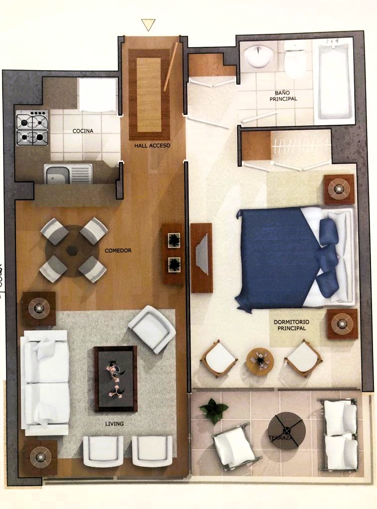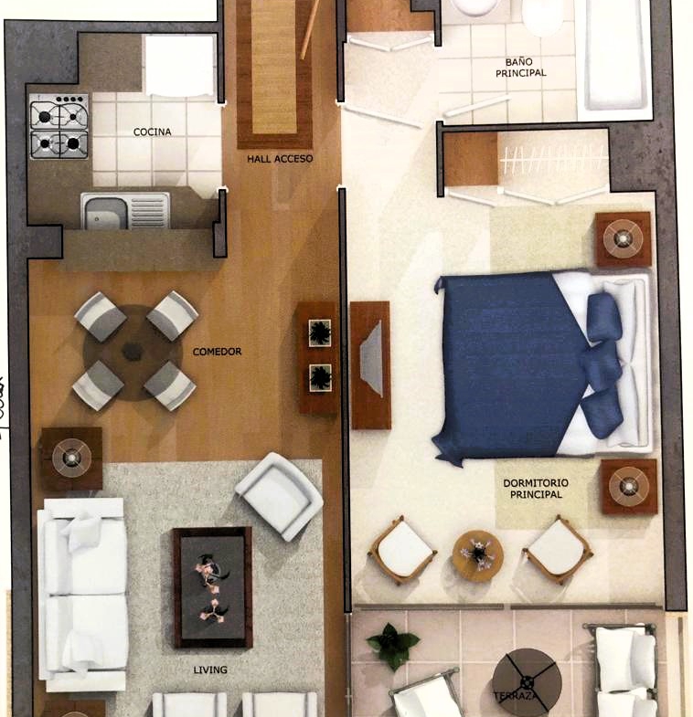 Cocina concepto abierto. Cómoda terraza, con acceso desde living y dormitorio.